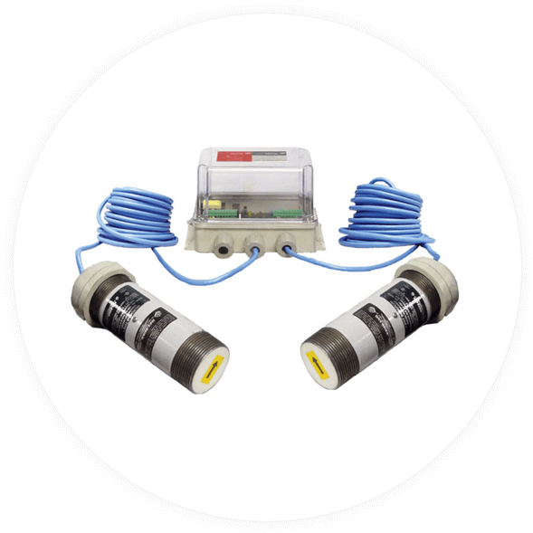 You need non-contact detection across a gap. A transmitter and receiver face each other across a chute, belt, or outlet. No probe in the material stream.