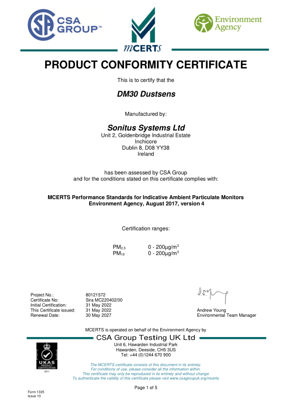 The UK Environment Agency’s Monitoring Certification Scheme for indicative ambient air monitors has awarded MCERTS approval to Ireland-based global environmental monitoring company, Sonitus Systems, for its air quality monitor product DM30 Dustsens.